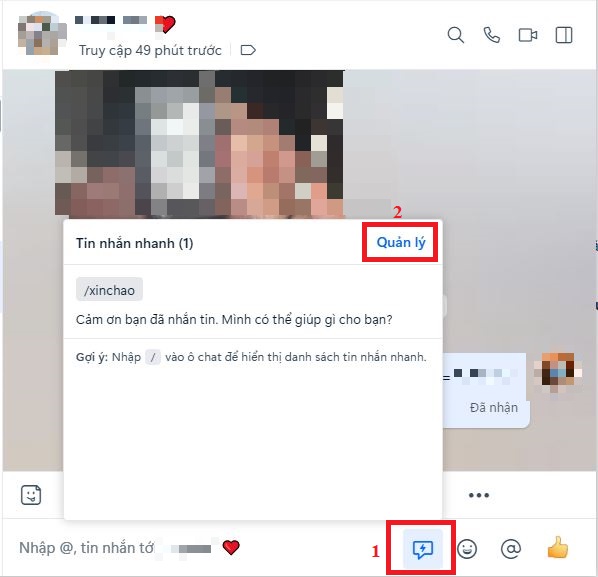 Khi muốn nhắn tin nhanh, người dùng chỉ cần nhấn phím gạch chéo (/) rồi nhập phím tắt tin nhắn nhanh đã cài đặt để hiển thị nội dung cần gửi.