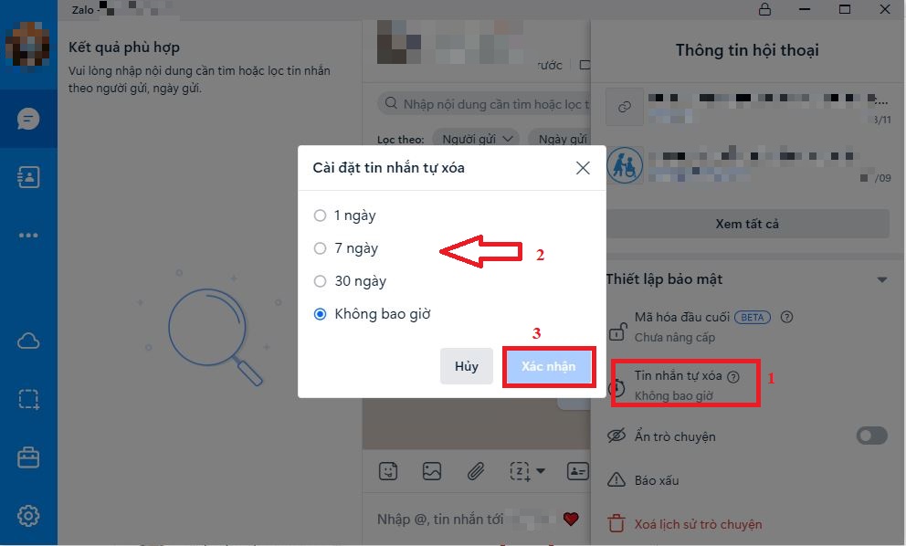 Zalo chat có hệ thống tự động xóa các tin nhắn khi người cài đặt sẵn. Bạn có thể thiết lập thời gian tự xóa sau 1 ngày, 7 ngày hoặc 30 ngày.