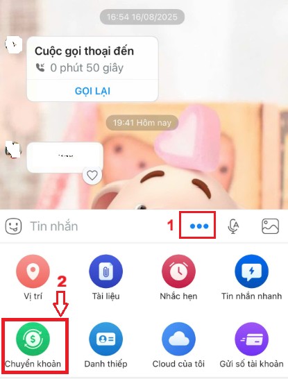 Các bước sử dụng: Tại khung chat với bạn bè => Chọn Biểu tượng 3 chấm => Chuyển khoản => Nhập số tiền cần chuyển => Nhập Lời nhắn (nội dung chuyển khoản) nếu có => Nhấn Chuyển khoản.