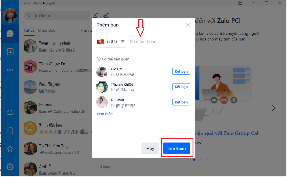 Bước 2: Nhập số điện thoại người mà bạn muốn thêm bạn để hiện người dùng và nhấn “Tìm kiếm”