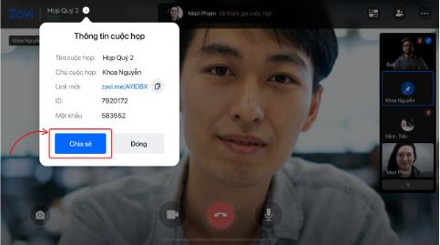 Bước 1: Tạo thành công cuộc họp, thông tin cuộc họp sẽ được hiển thị, Nhấn nút Chia sẻ để gửi thông tin cuộc họp đến các thành viên.