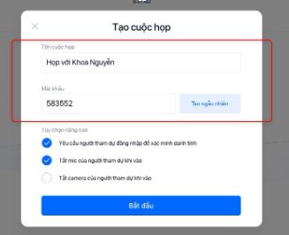 Bước 2: Cửa sổ Tạo cuộc họp hiển thị, bạn nhập Tên cuộc họp và Mật khẩu. Ngoài ra, bạn có thể tick vào một số tùy chọn nâng cao khác.